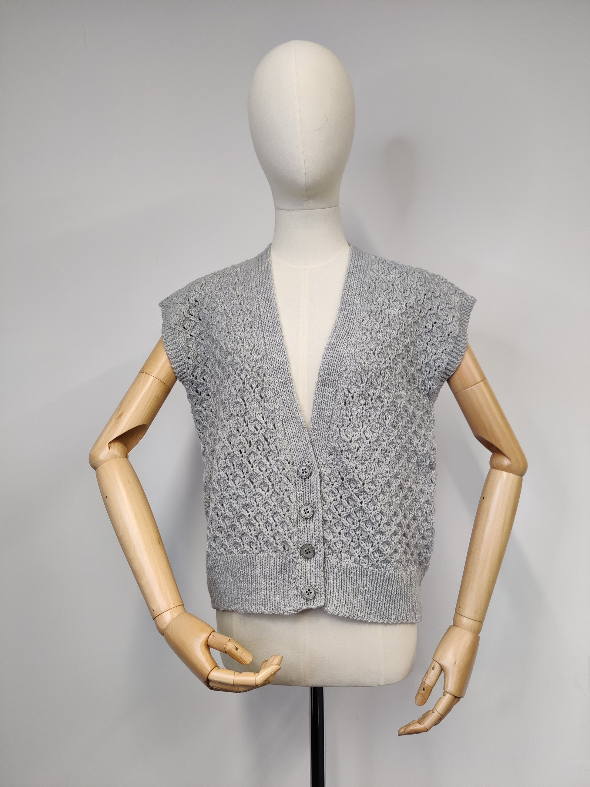 This is a lovely silver grey hand knitted waistcoat. It has a gorgeous patterned cable stitch throughout.