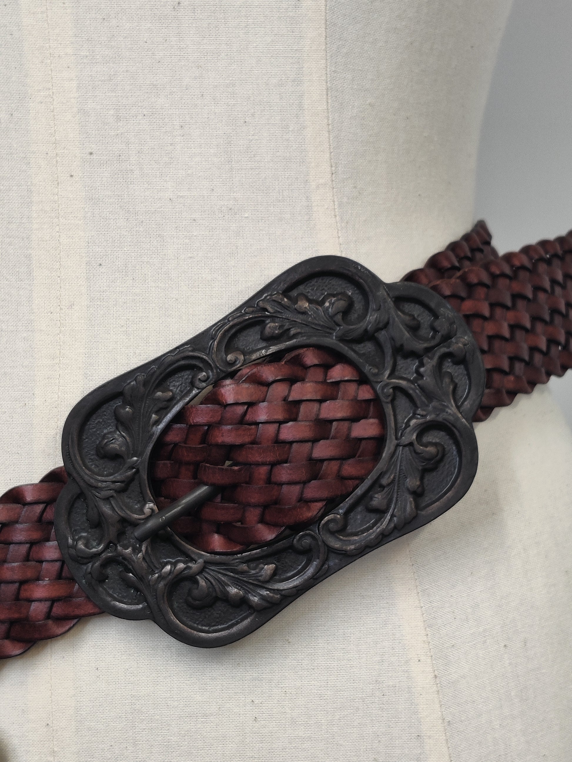 It has a decorative dark silver toned metal rectangular buckle that can be fastened anywhere along the plaited belt