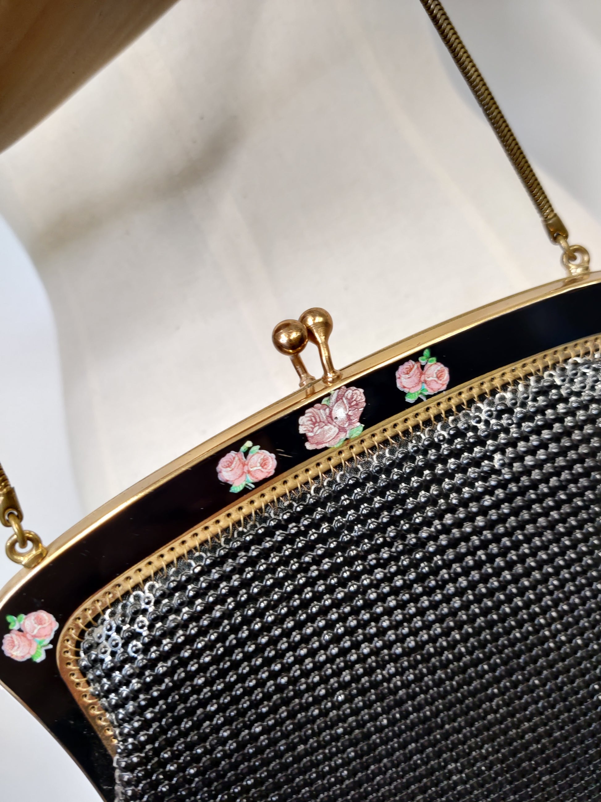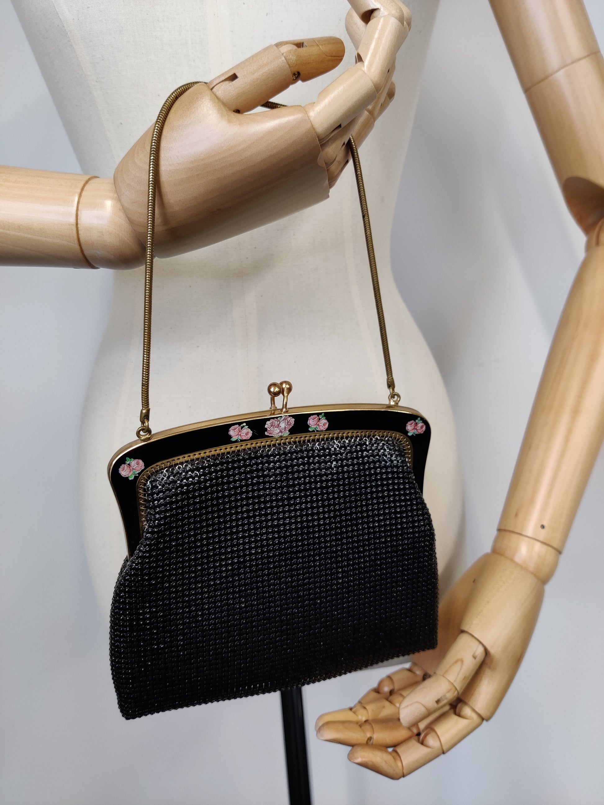 This is a gorgeous 1950s/60s black metal mesh bag with a delightful gold frame enamelled in black and decorated with pink roses (both front and back).