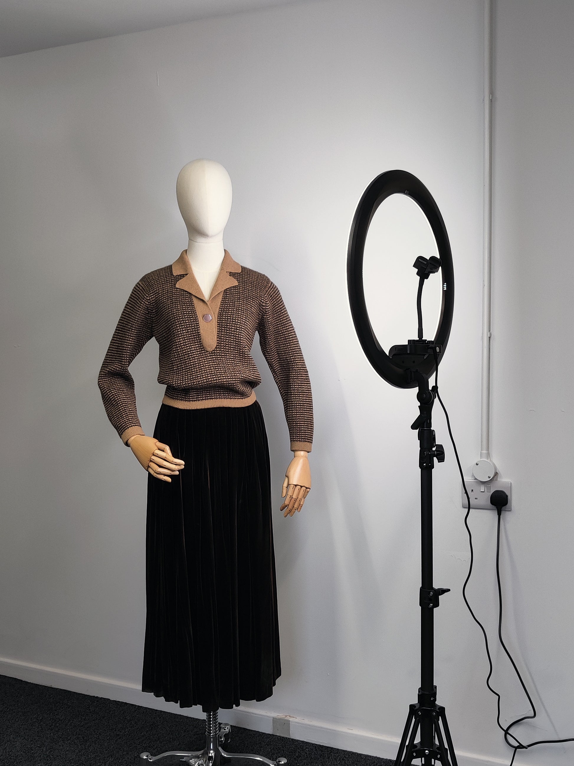 Made by Munrospun in Edinburgh, Scotland, this is a gorgeous lambswool and camel hair jumper in a mix of brown and camel colours. It is a ribbed knit in alternating stripes which gives an overall tweed/checkered pattern effect.