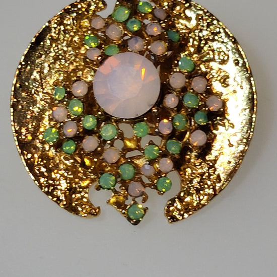 In gold tone metal it features a textured disc with a cut out section overlard with a geometric latticework pattern of rhinestones and diamante in shades of pastel green and pink. Overall creating a 3D almost Art Deco effect to the brooch.