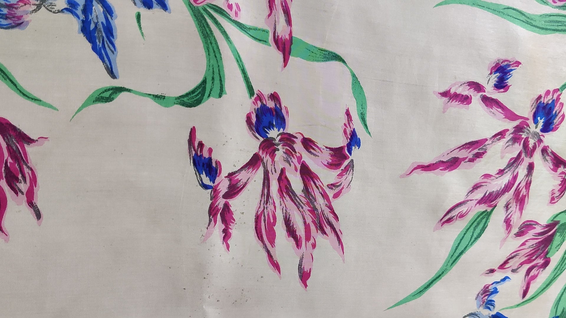 The scarf has hand rolled edges and is in vintage condition. It shows signs of wear and age with some small marks and thinning in areas but is perfectly wearable. Please view all images and the video. It has also been gently hand washed and pressed ready to wear.