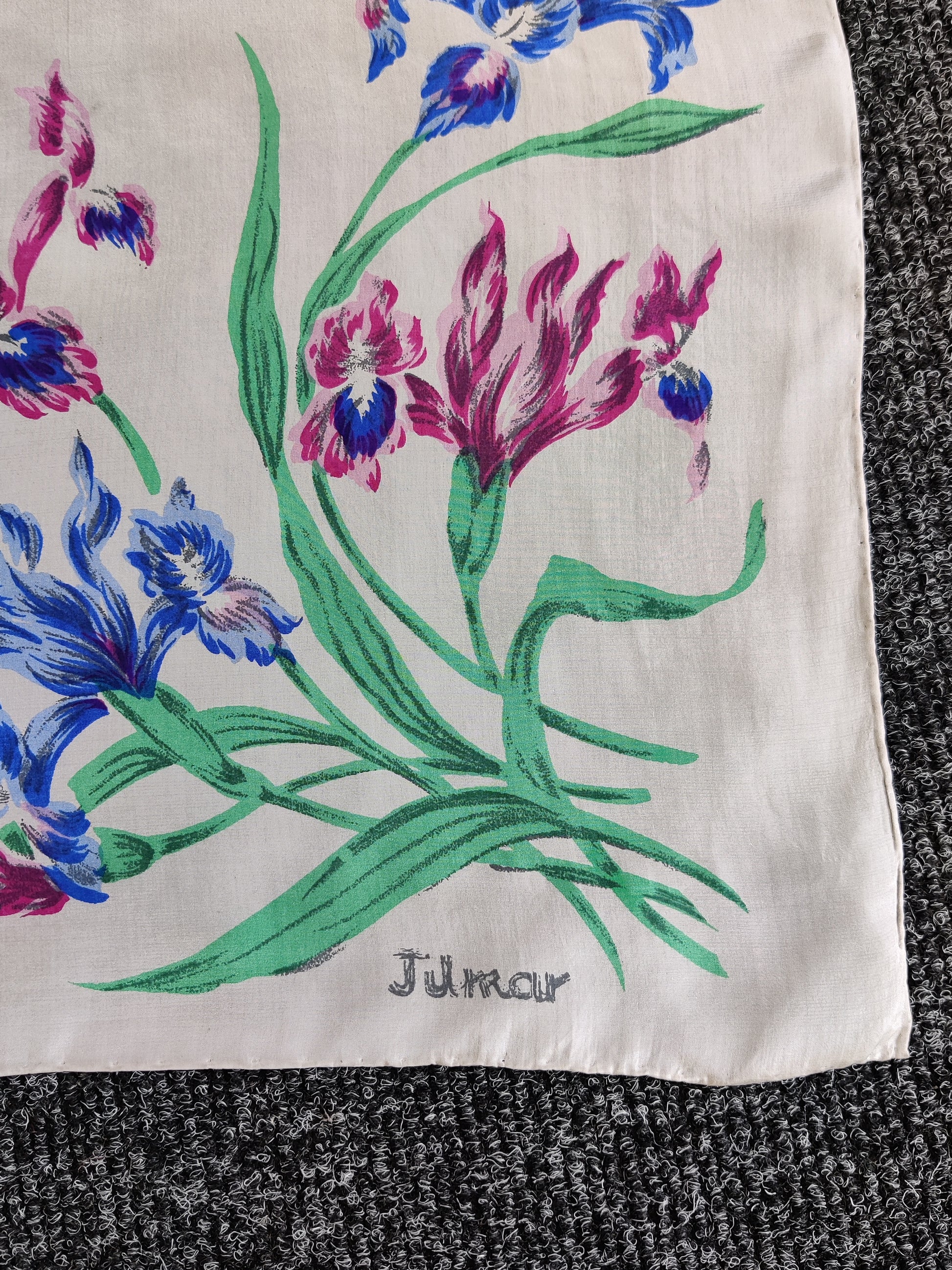 This is a beautiful vintage silk scarf by Jilmar dating to the 1950s.
