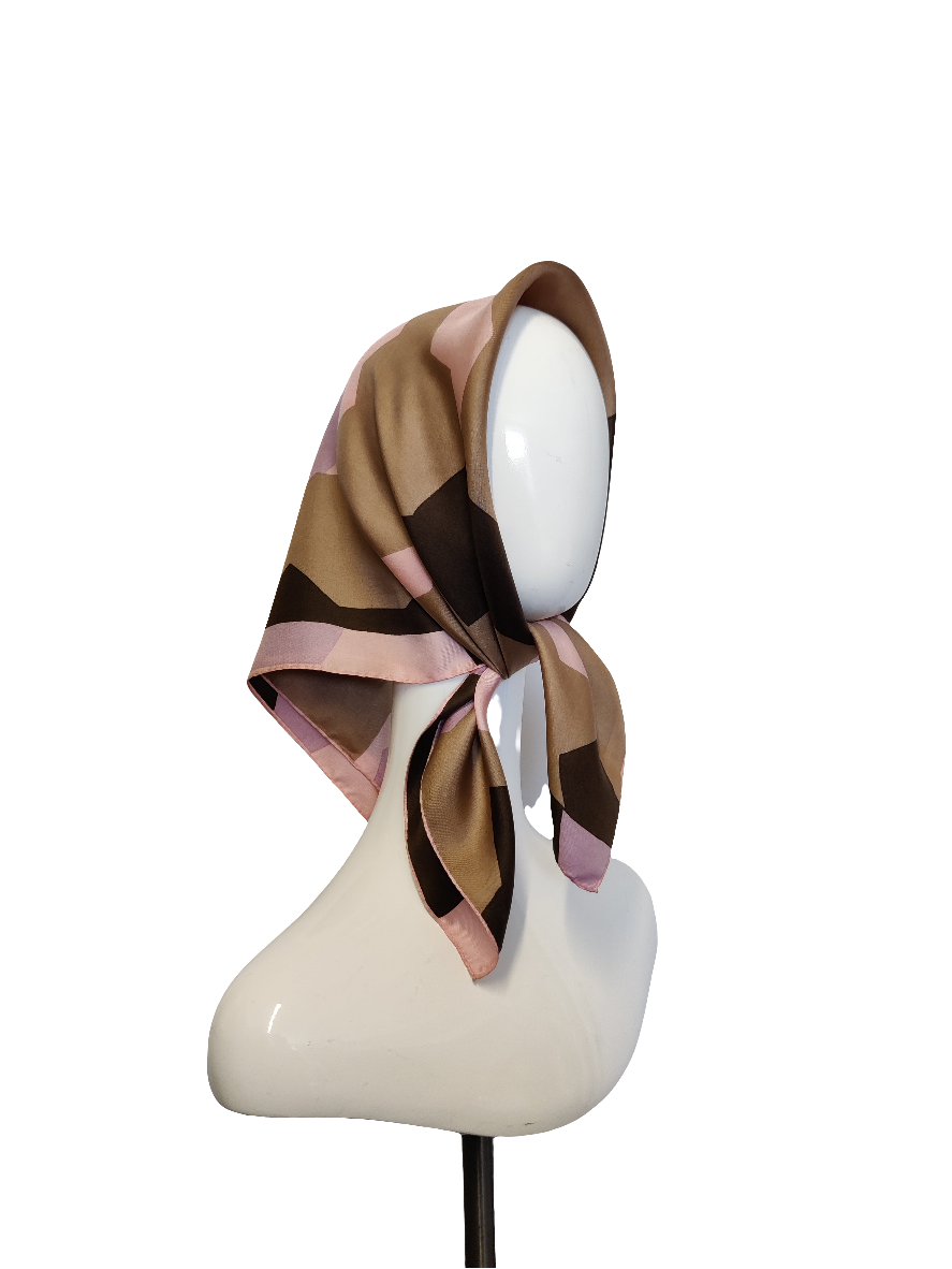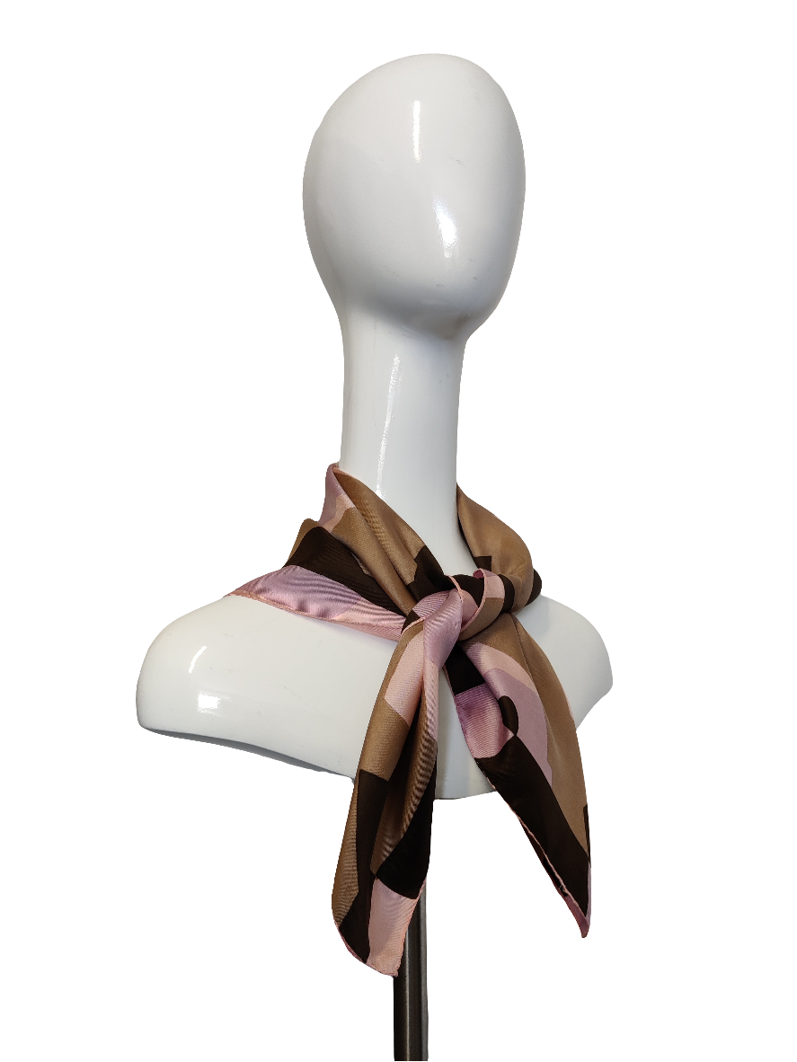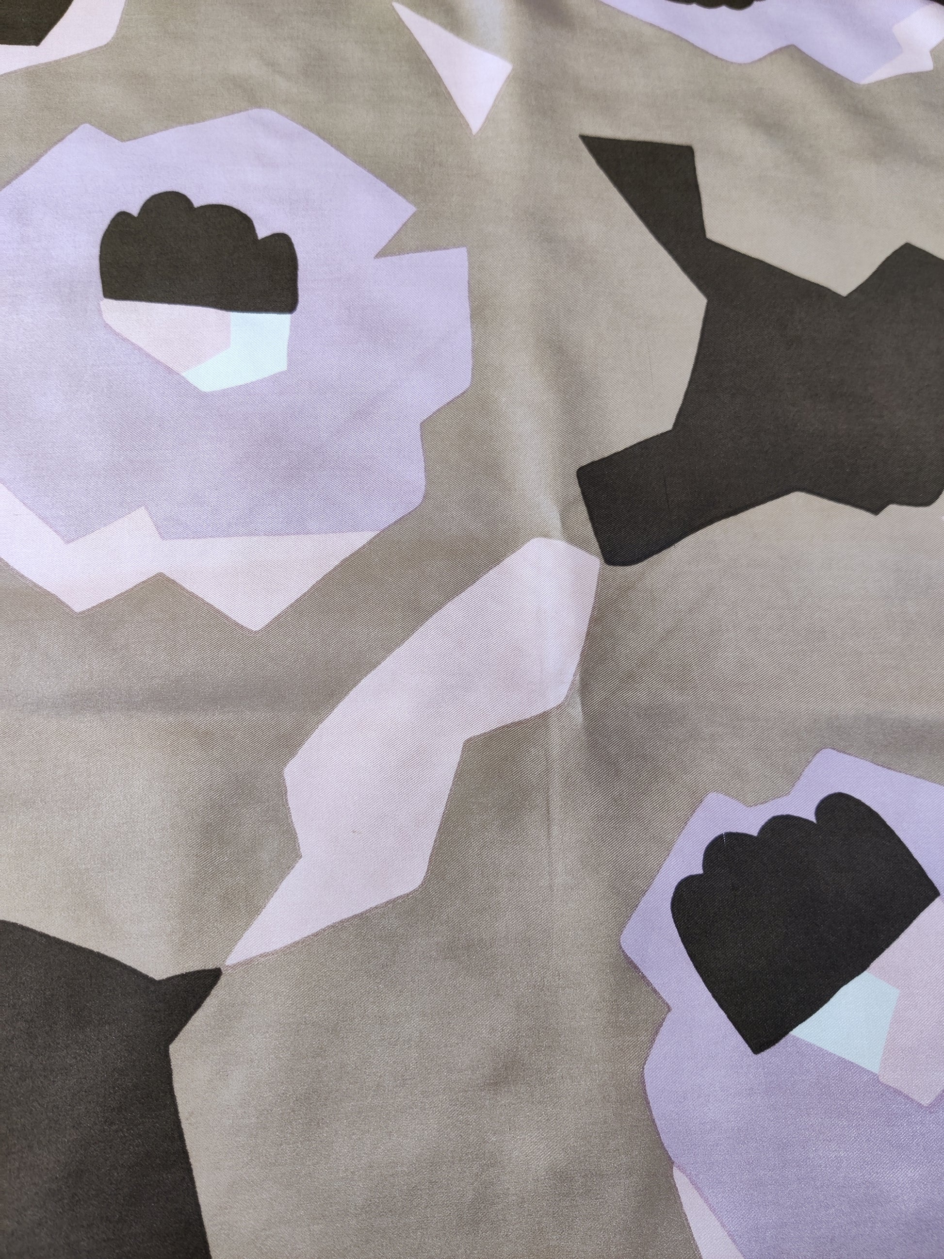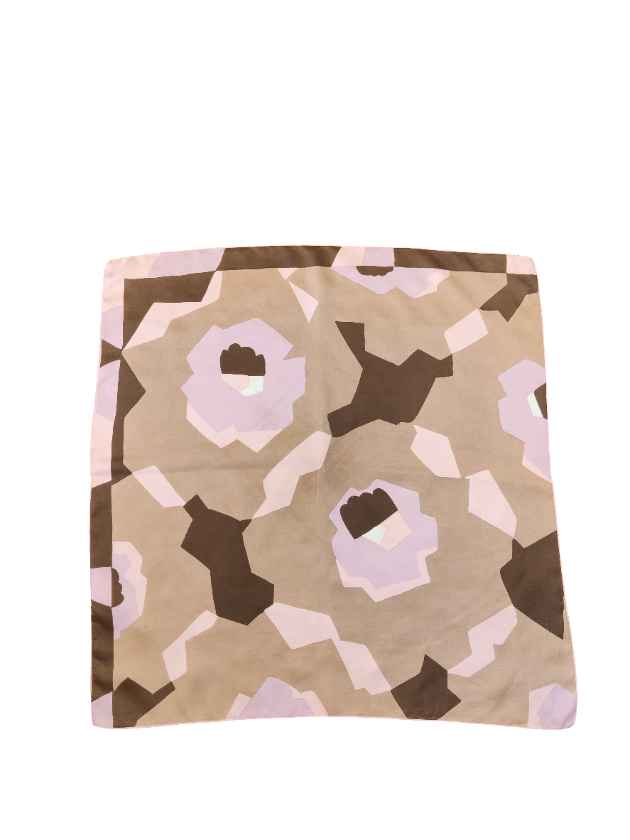In pinks, browns and black it features a stylised floral design rendering it almost a geometric pattern.