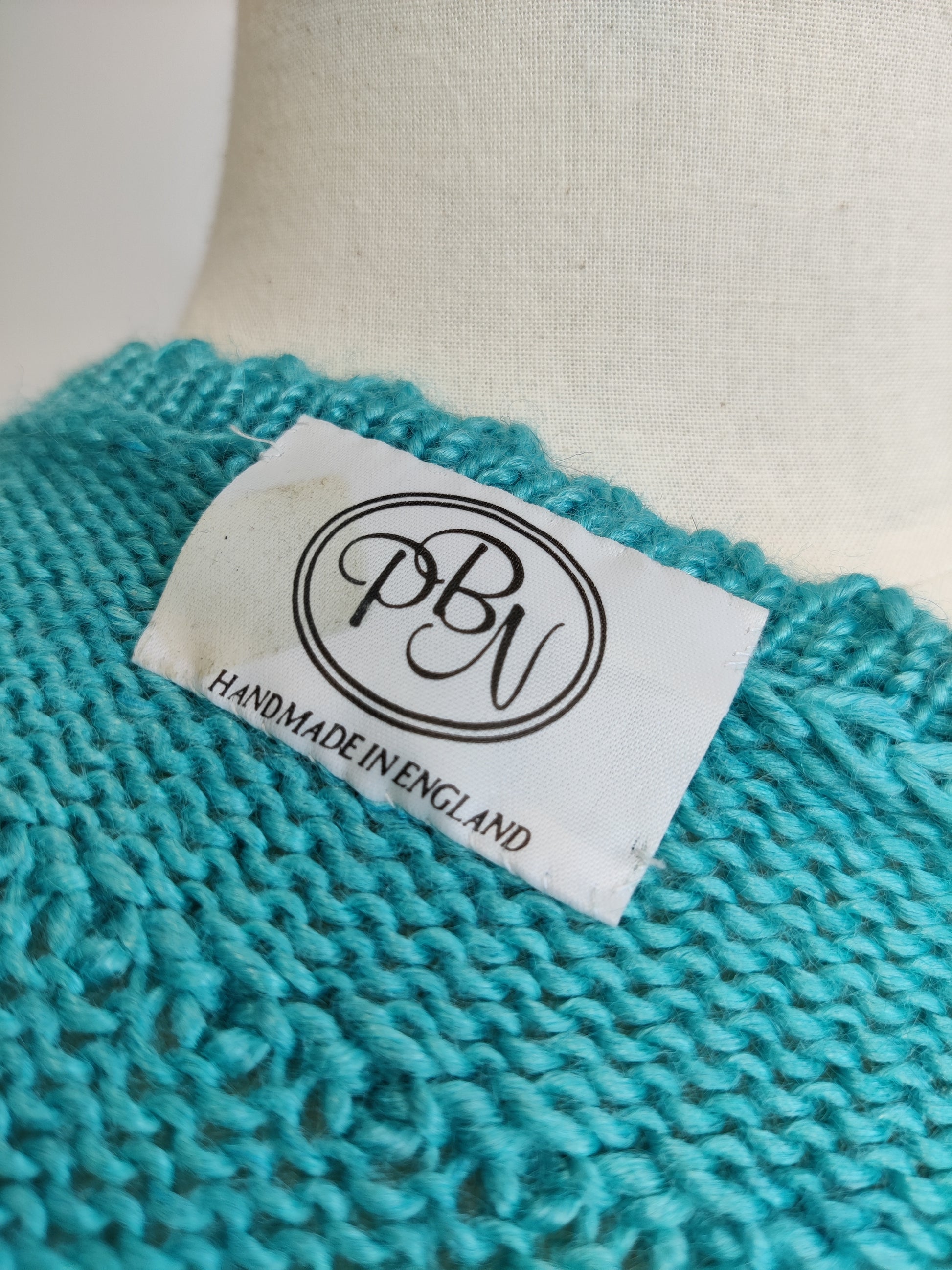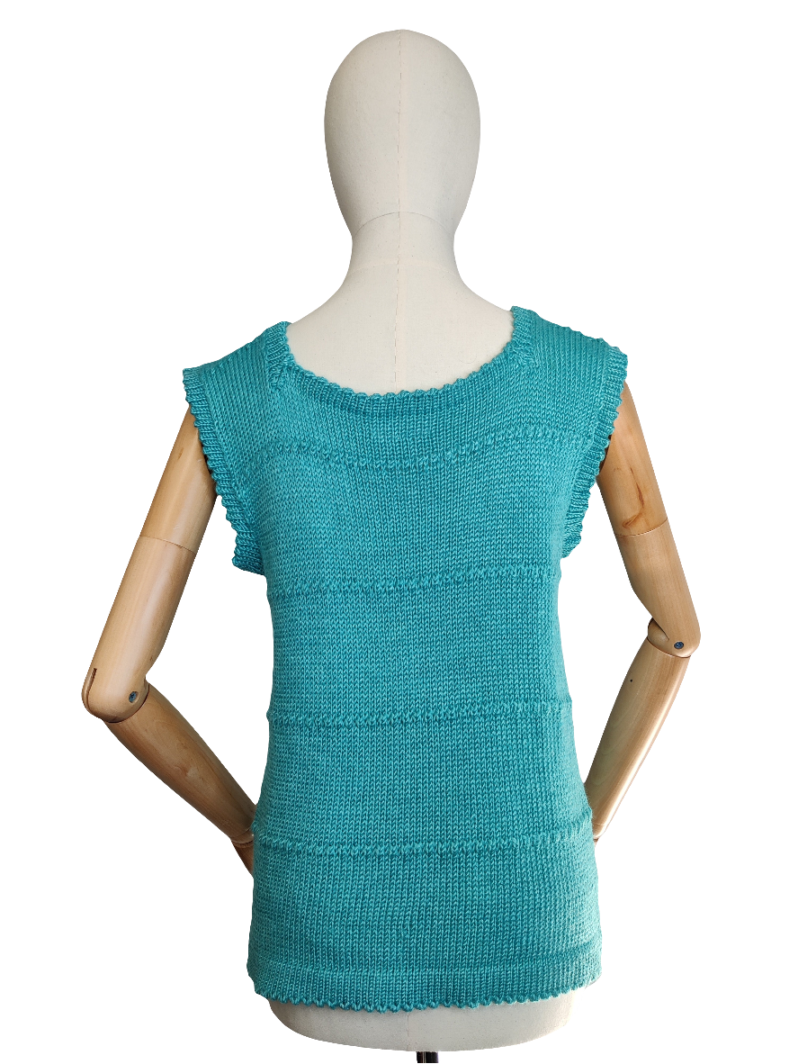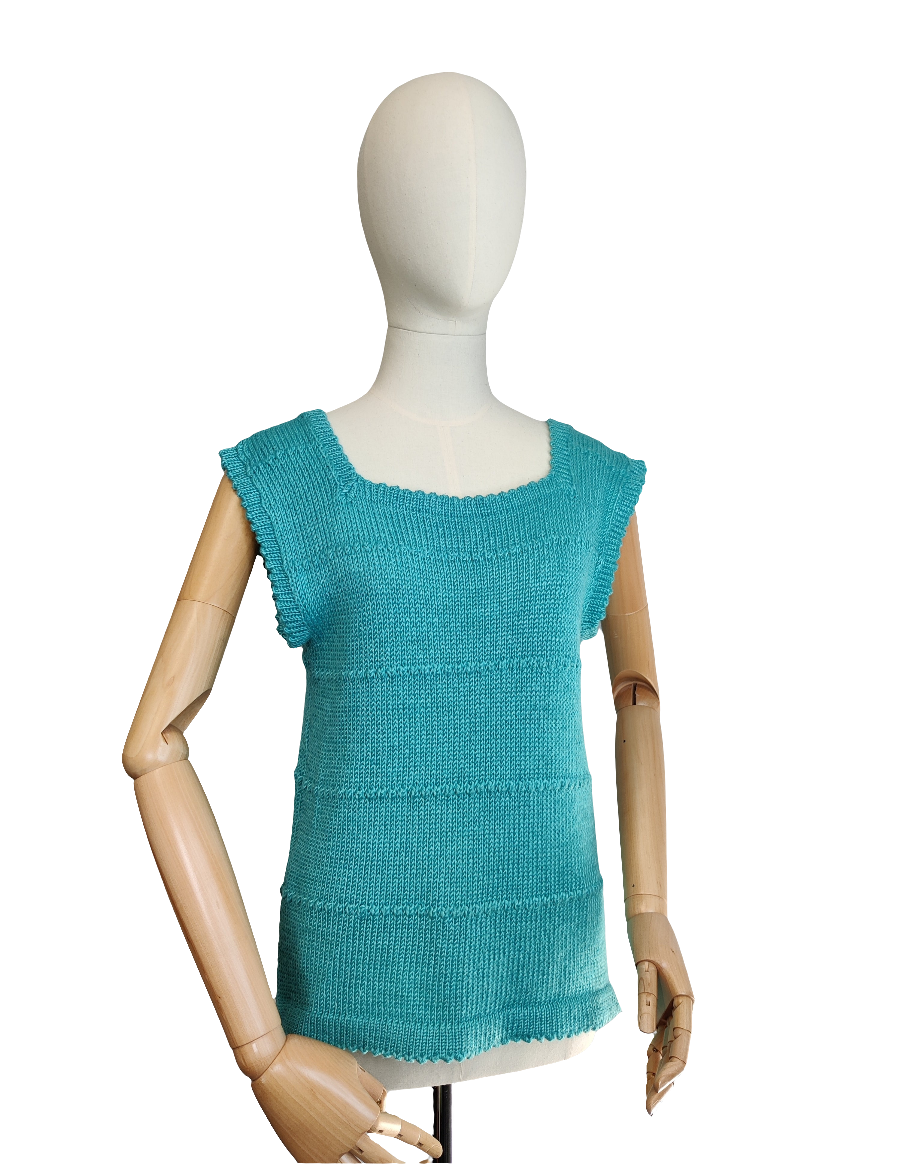 This is a vintage knit (circa 1980s) in a simple slipover style with a short cap sleeve. It's a lovely turquoise blue shade and features a fine contrasting knit patterned stripe at intervals.