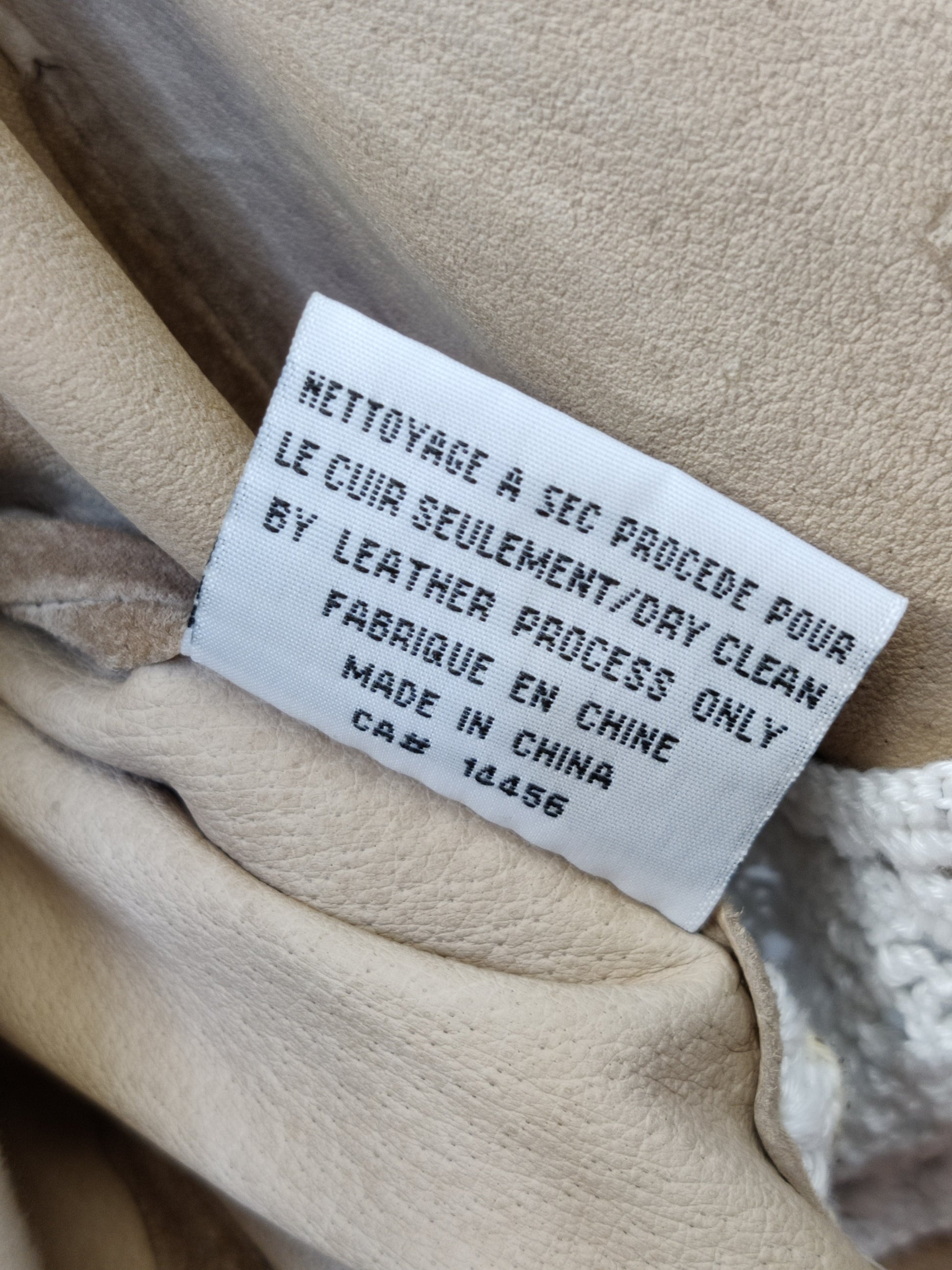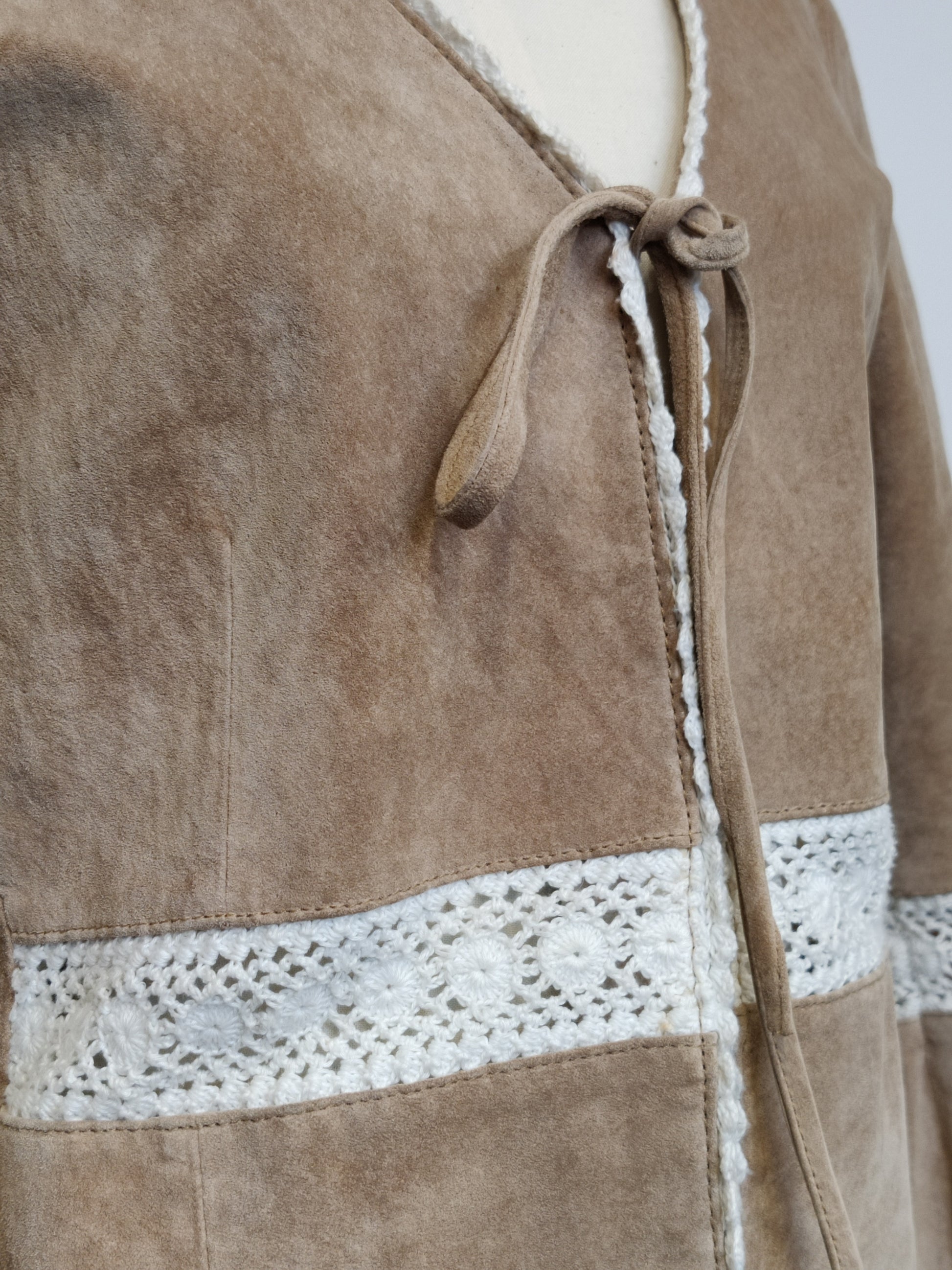 In a soft beige suede it features white crocheted lace edging including at the cuffs. It has lace insets (approx 2ins wide) to the front at the waist and at the centre of the sleeves.