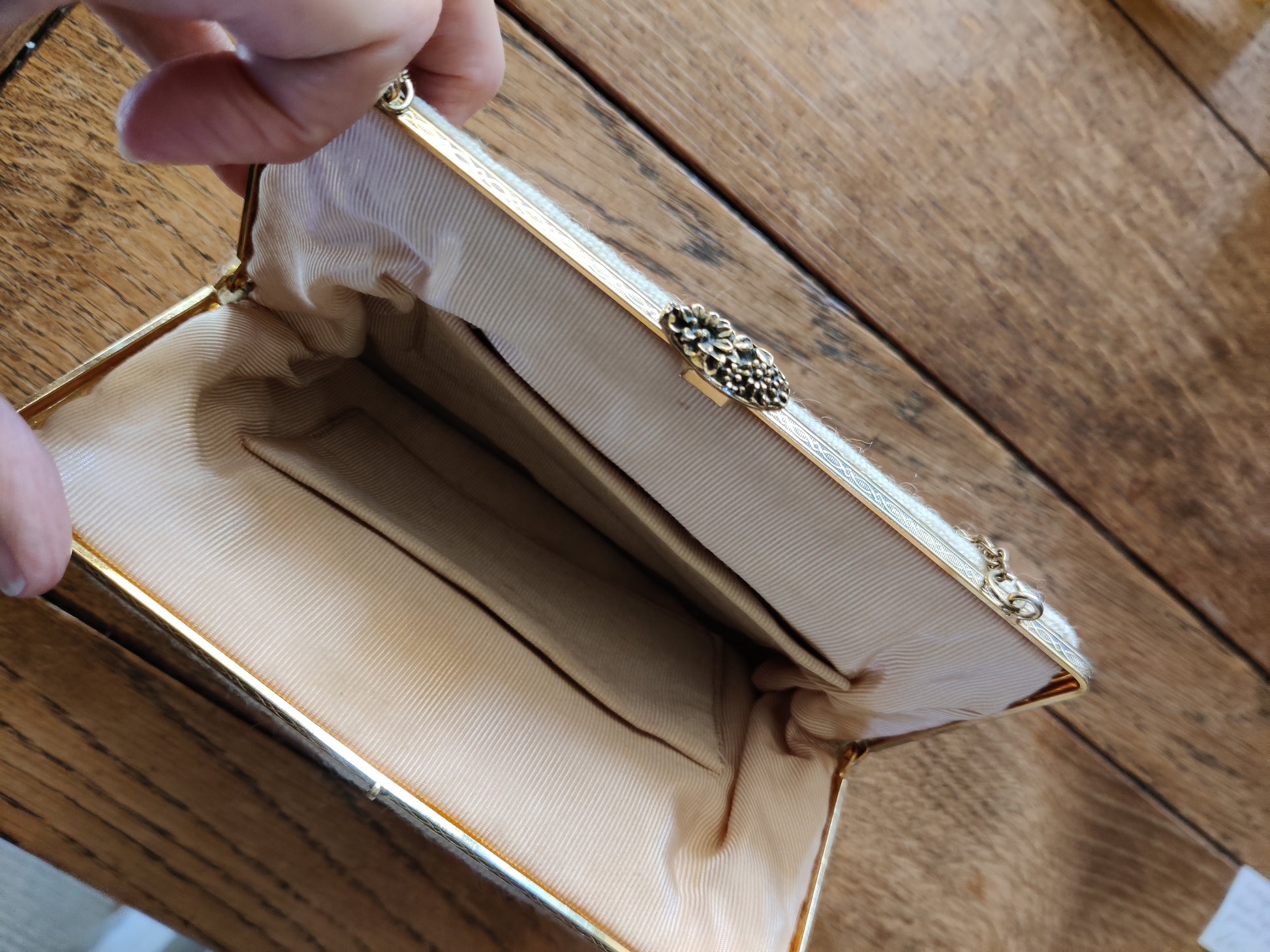 It has a lovely floral design to both sides and a gold metal top frame with a decorative floral firm clasp. It also has a little clasp top purse in the same fabric as the lining tucked into the interior.