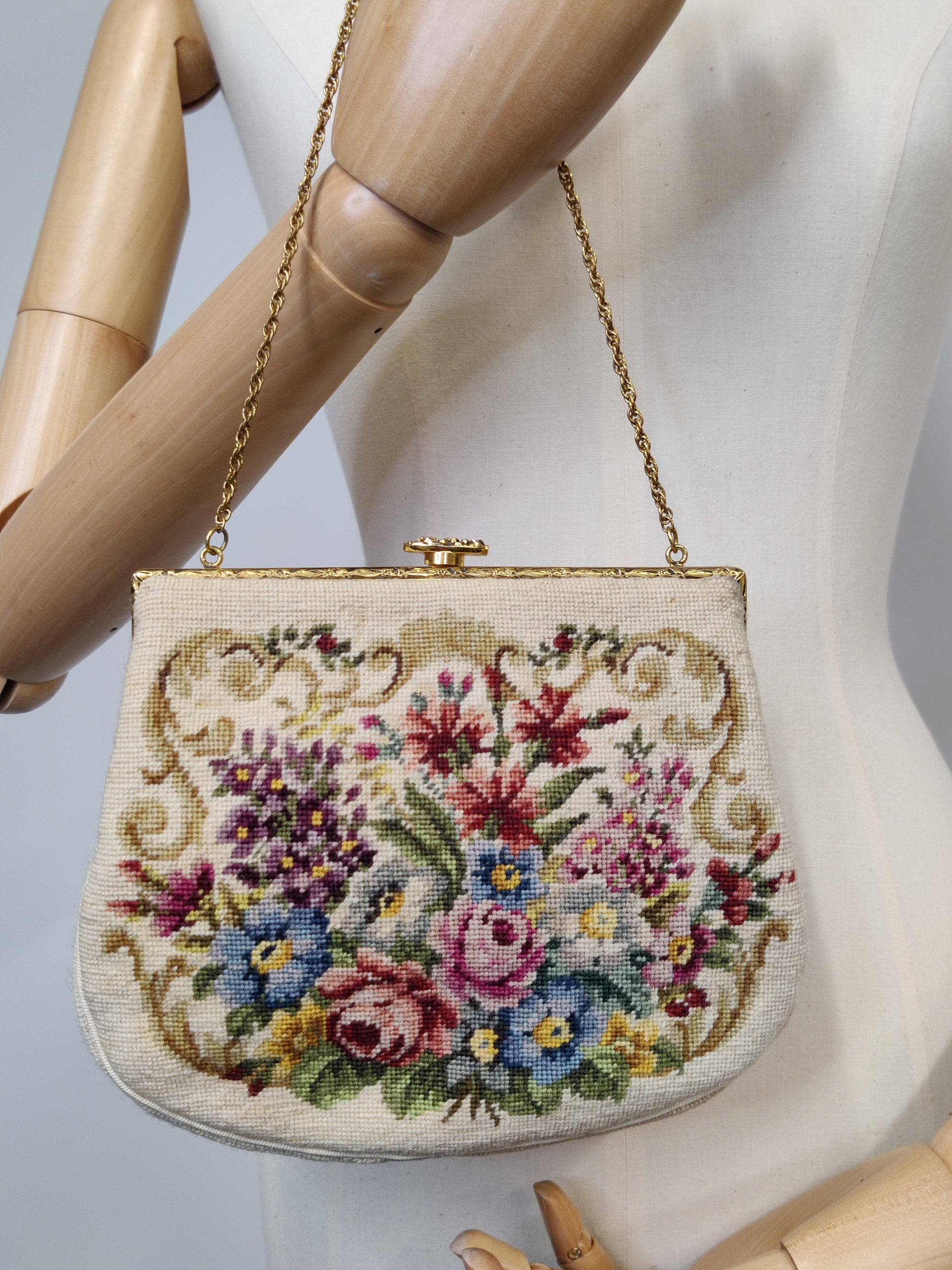 This is a pretty tapestry/petit point bag dating to the 1950s.