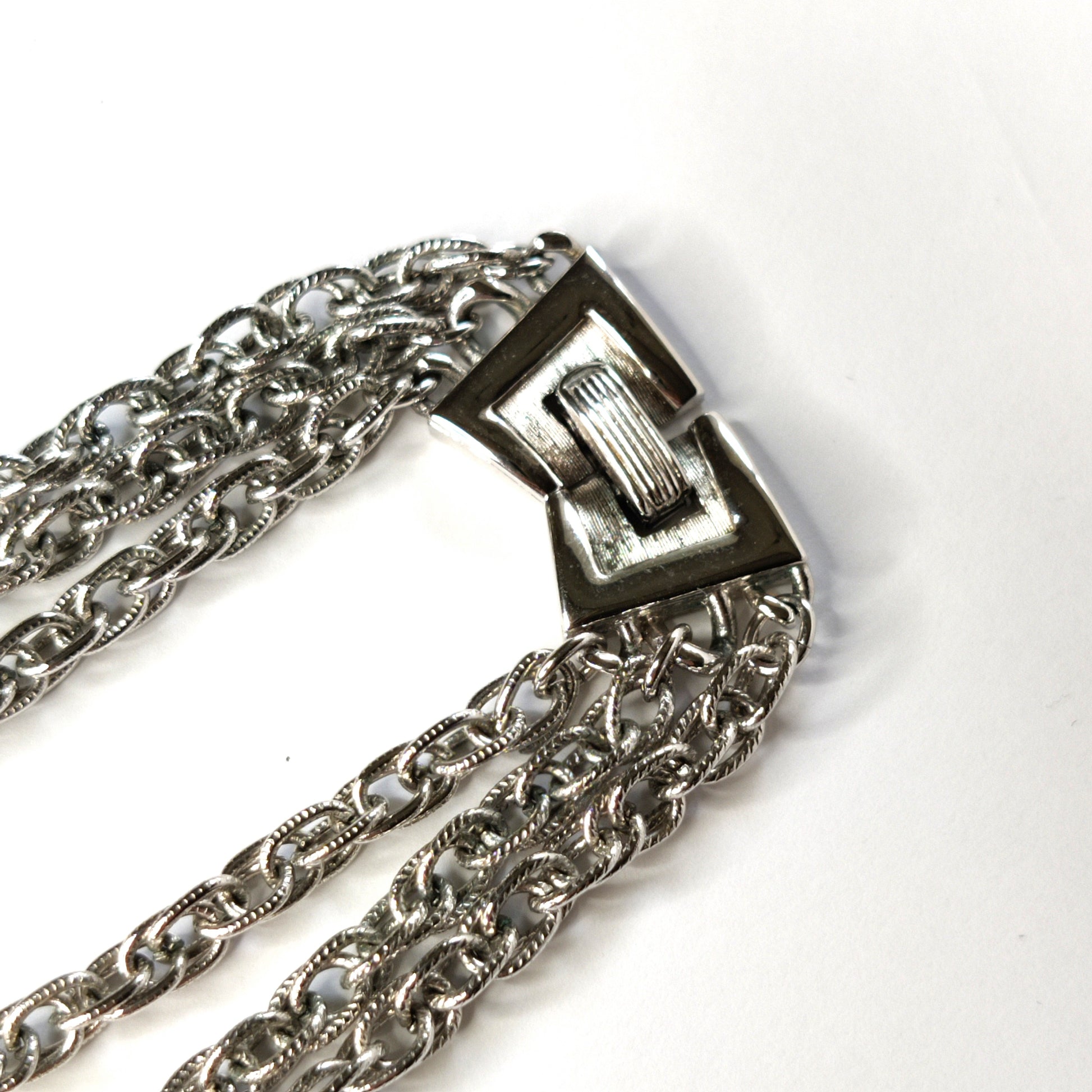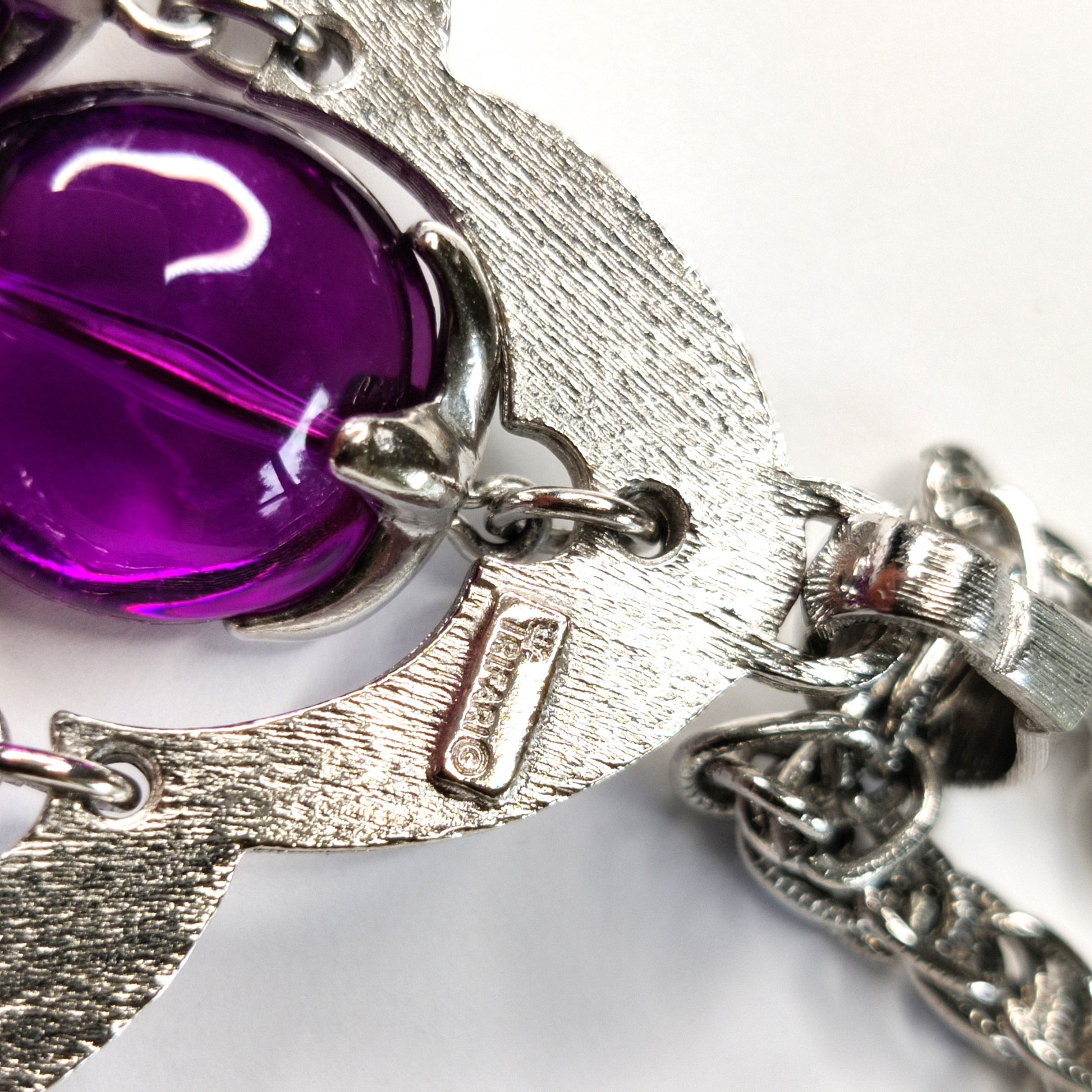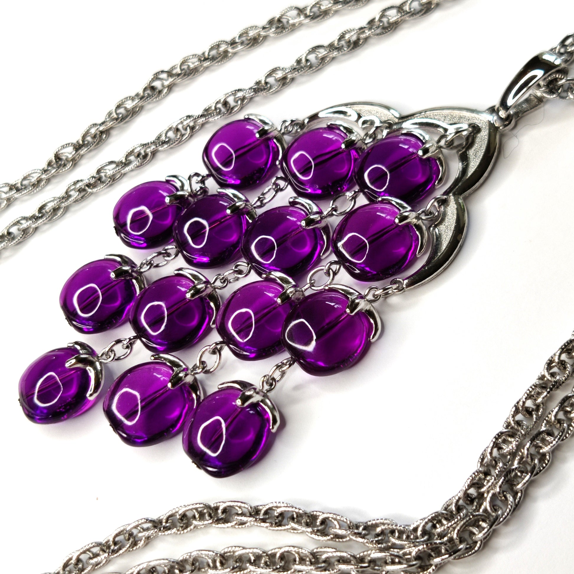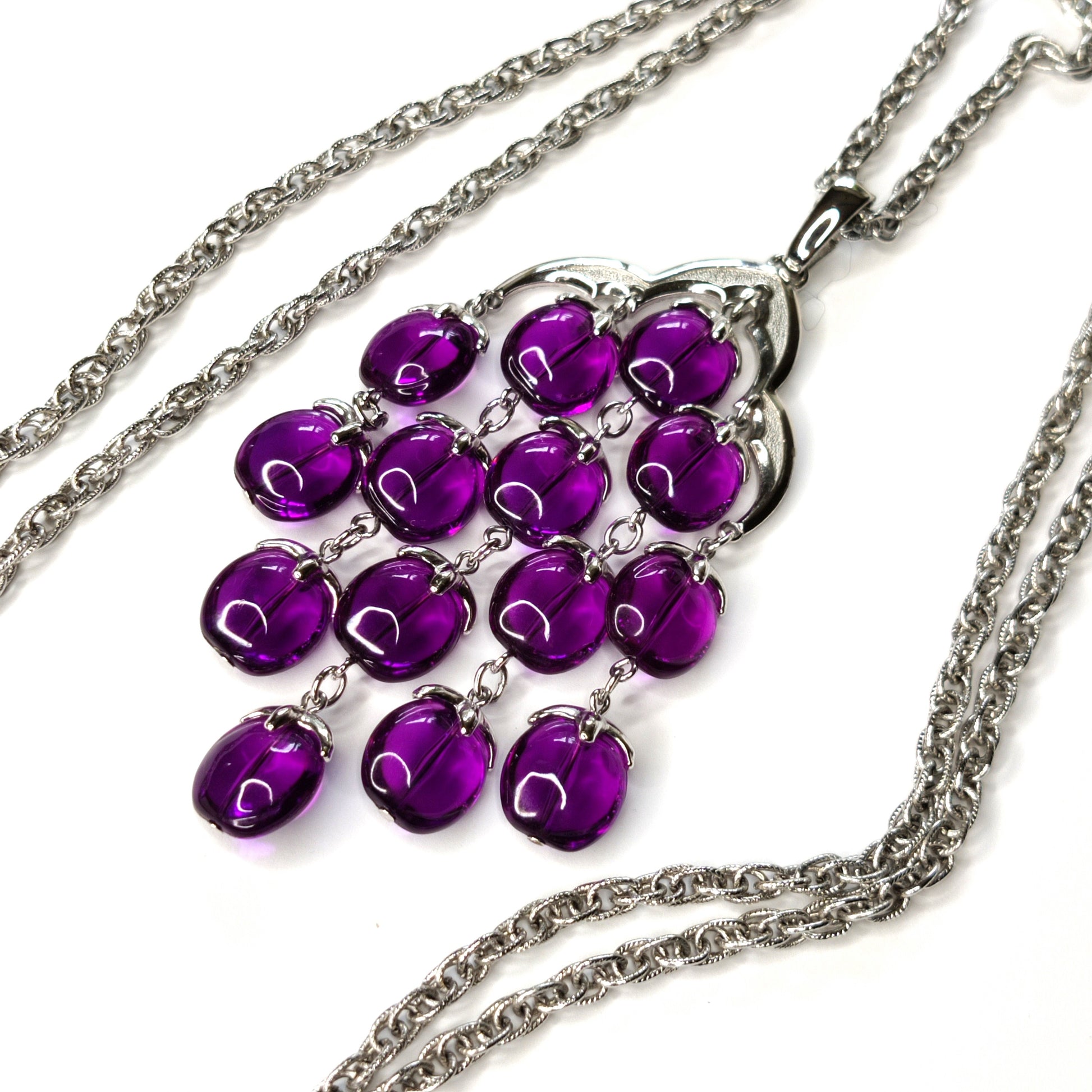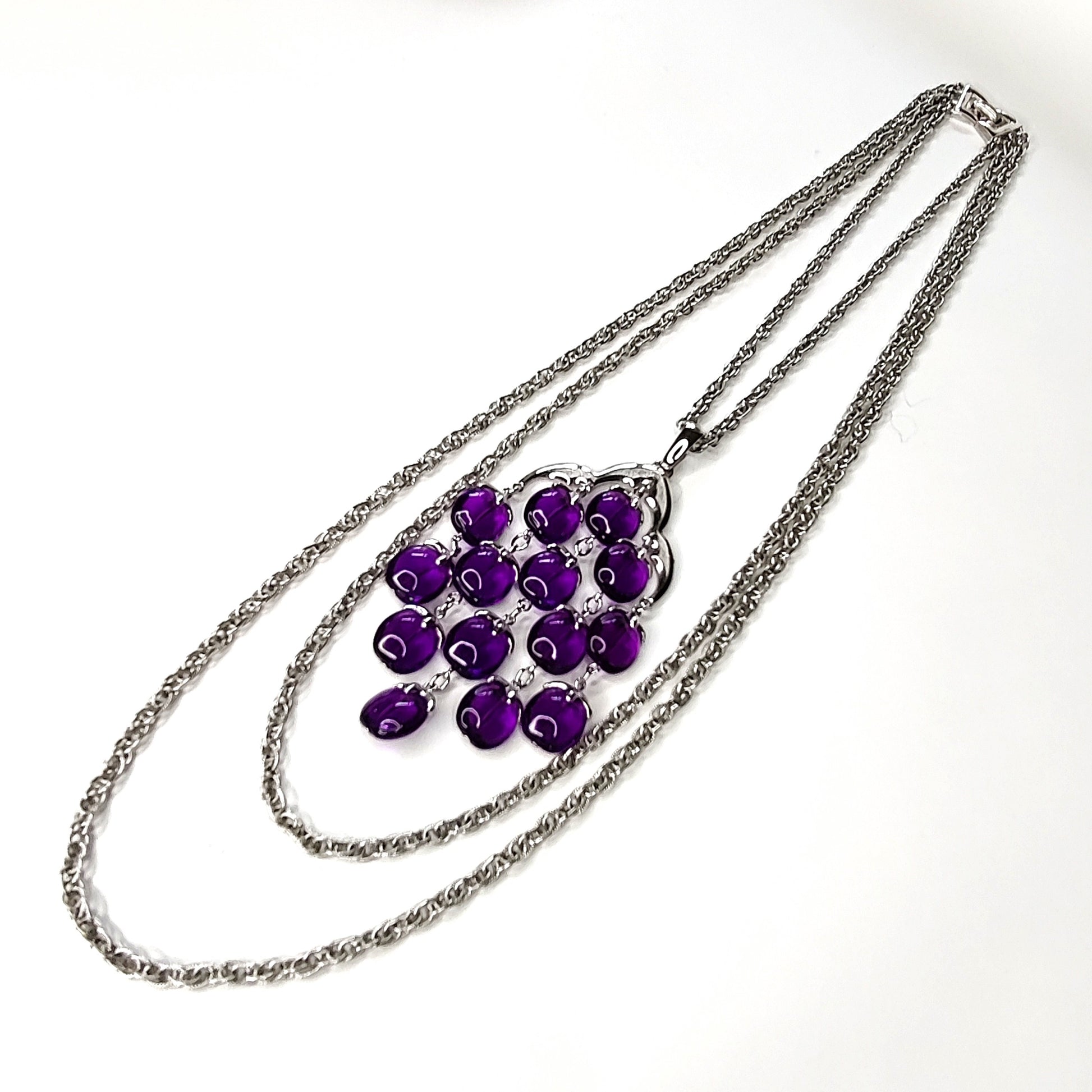 In silver tone metal this is a three stranded long necklace with the inner strand featuring a waterfall pendant of amethyst coloured glass beads (14 in total). The light catches the glass beads beautifully as the necklace moves. The chains features textured rope edge links.