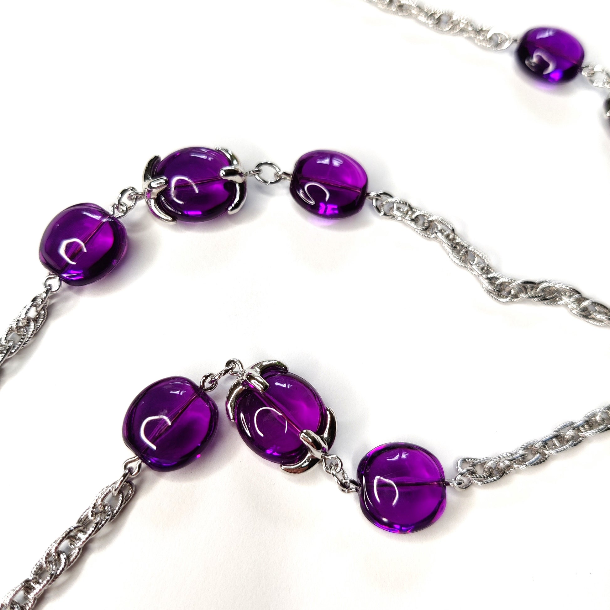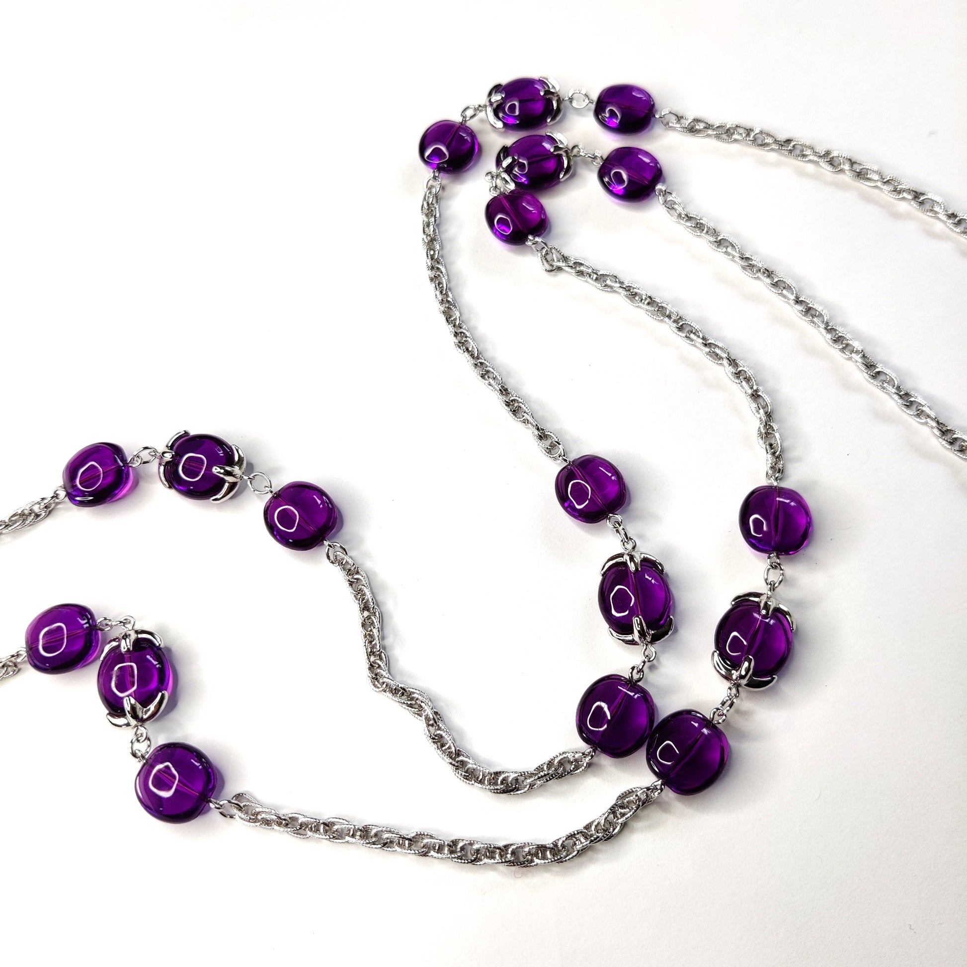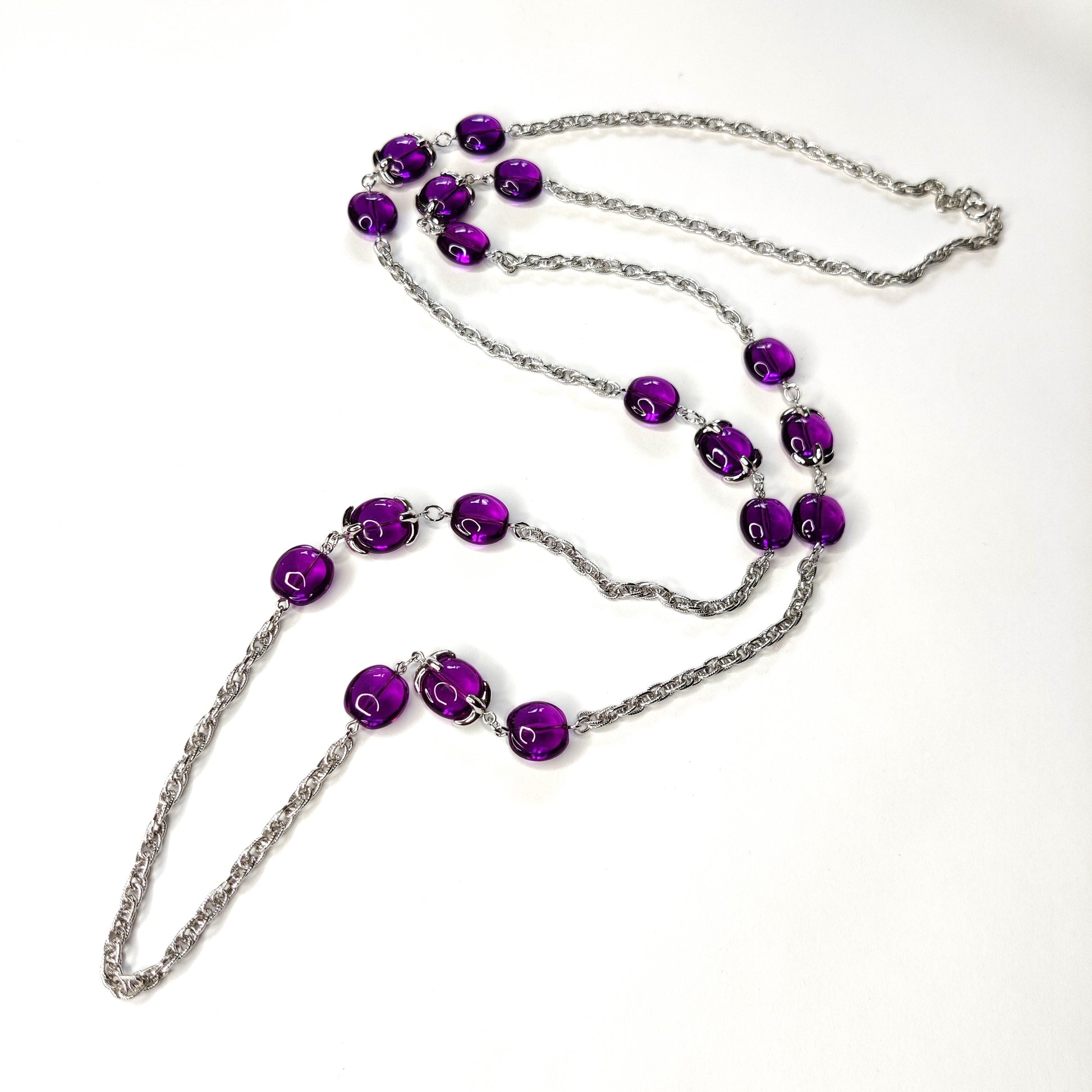 In silver tone metal this is a single stranded very long necklace featuring amethyst coloured glass beads (18 in total). The light catches the glass beads beautifully as the necklace moves.