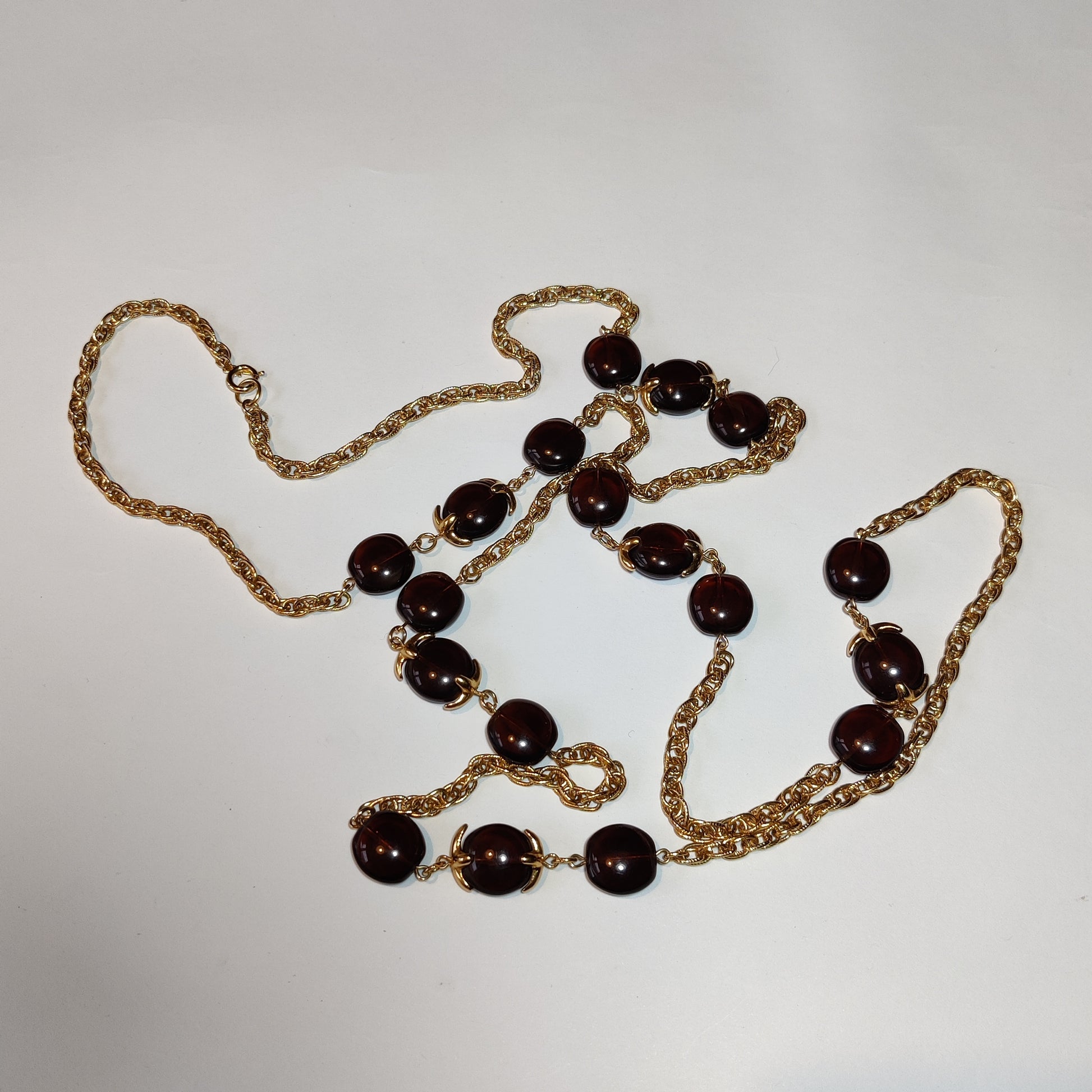 Dating to the 1950s/60s it is a long gold tone metal link chain with rich brown lucite beads set along it length.