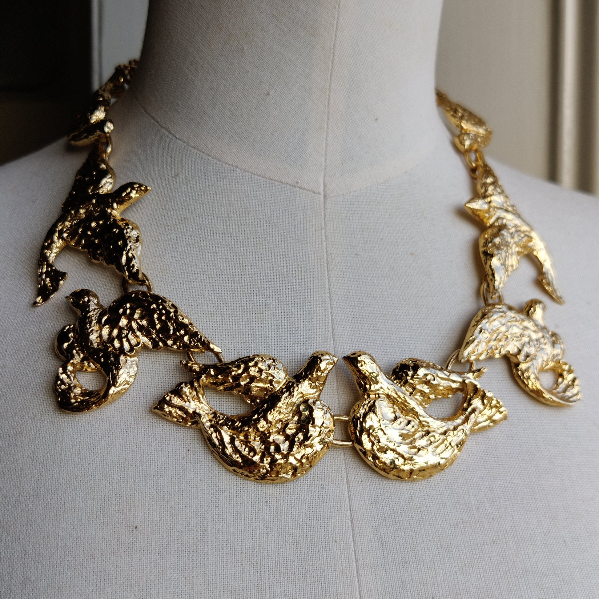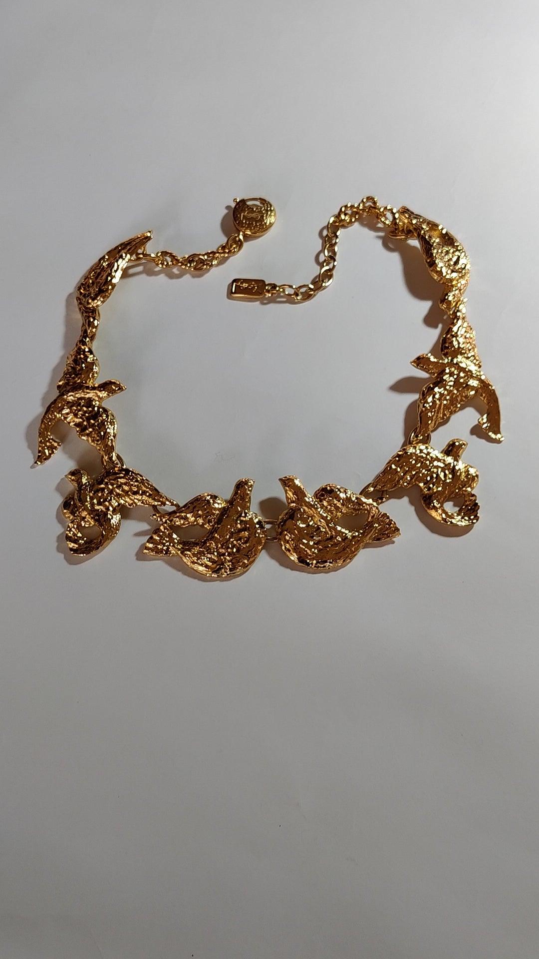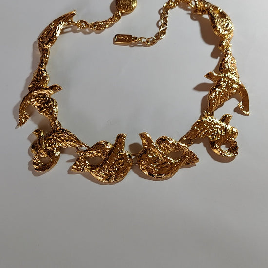 This gold plated metal necklace features textured doves in differing positions meeting at the centre 'beak to beak. Doves are known as a symbol of peace.