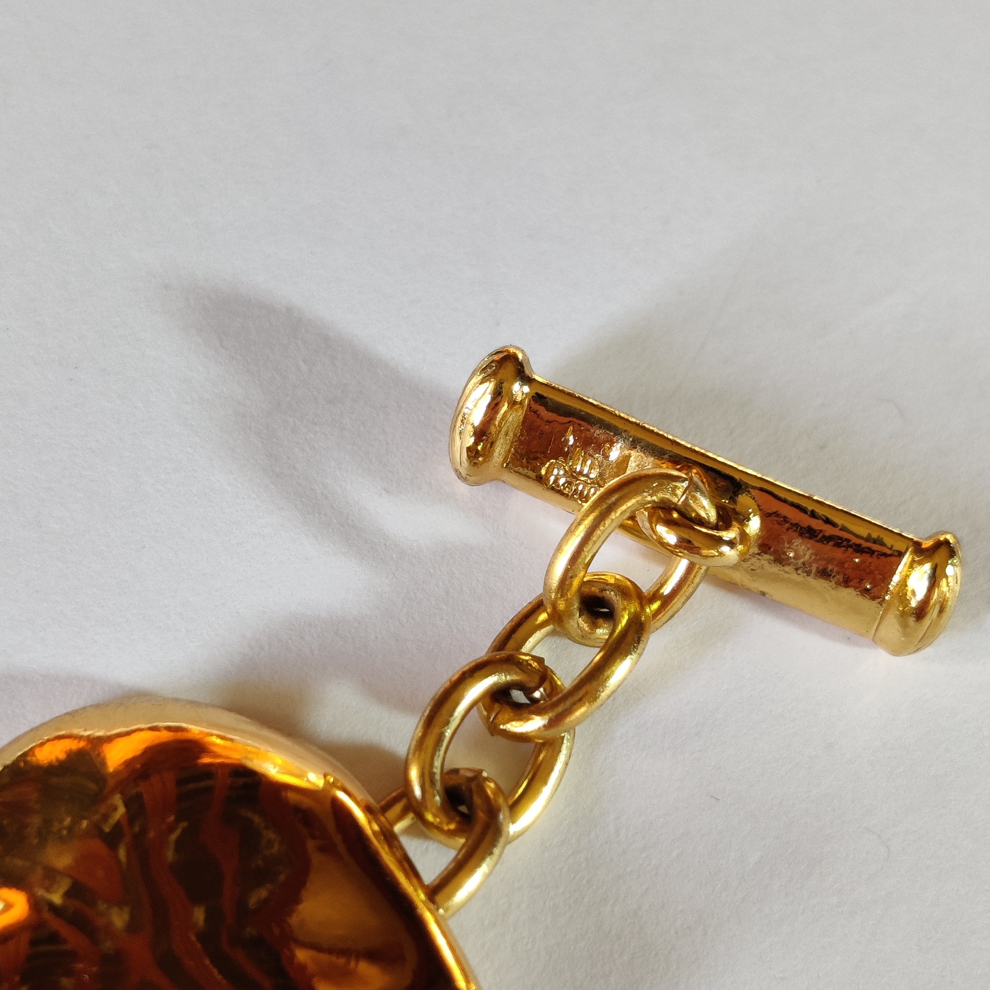 It has three signed open heart extender links forming part of the toggle clasp which is also signed 'Made in France'. The back of one of the hearts is also signed 'YSL Made in France'