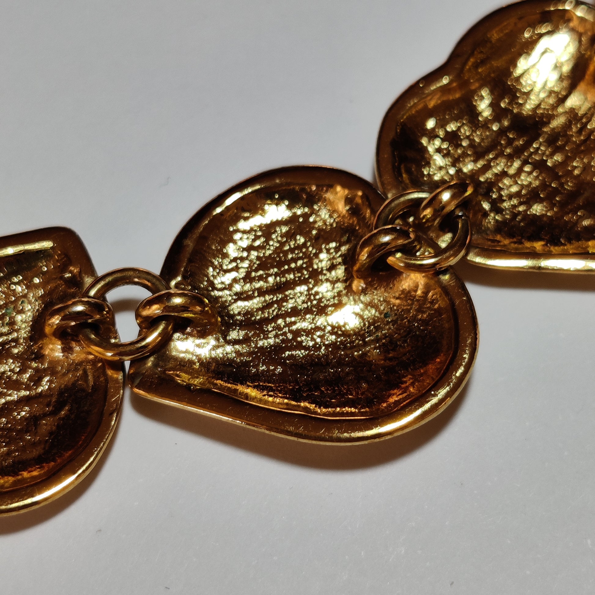 Featuring linked domed tactile hearts it is gold plated and has a deep rich almost coppery rose gold to it's tone. The articulated linked hearts are offset to each other.