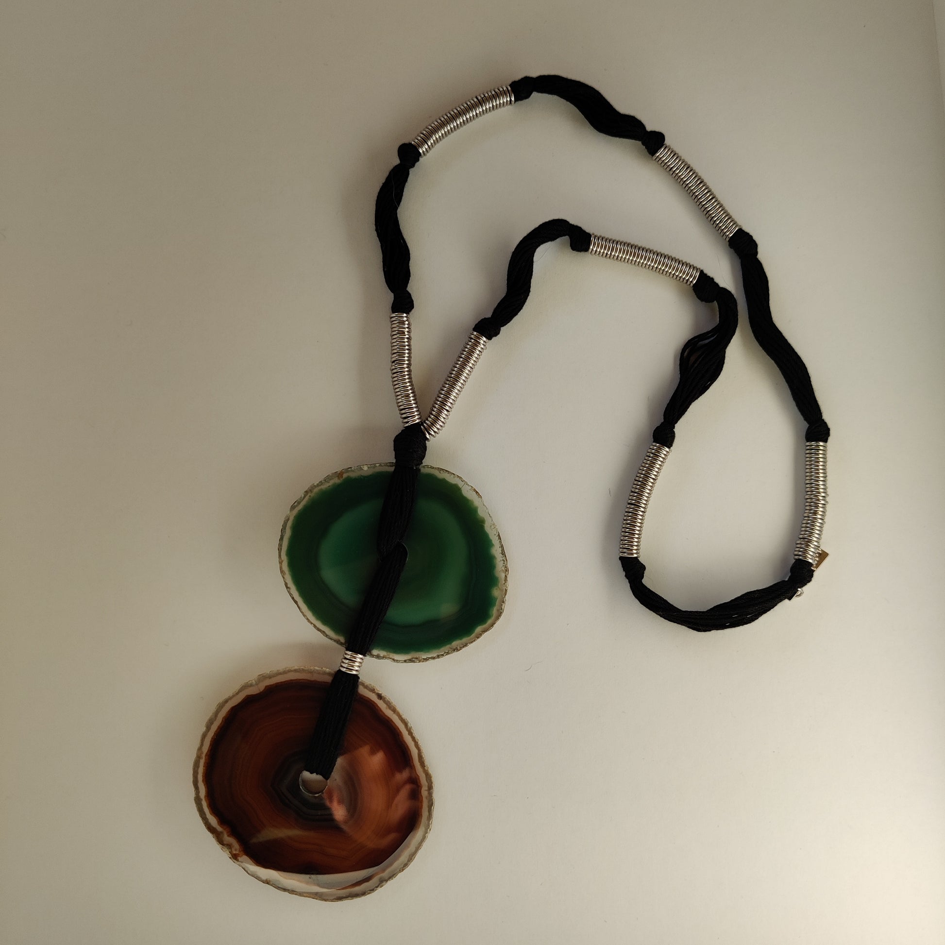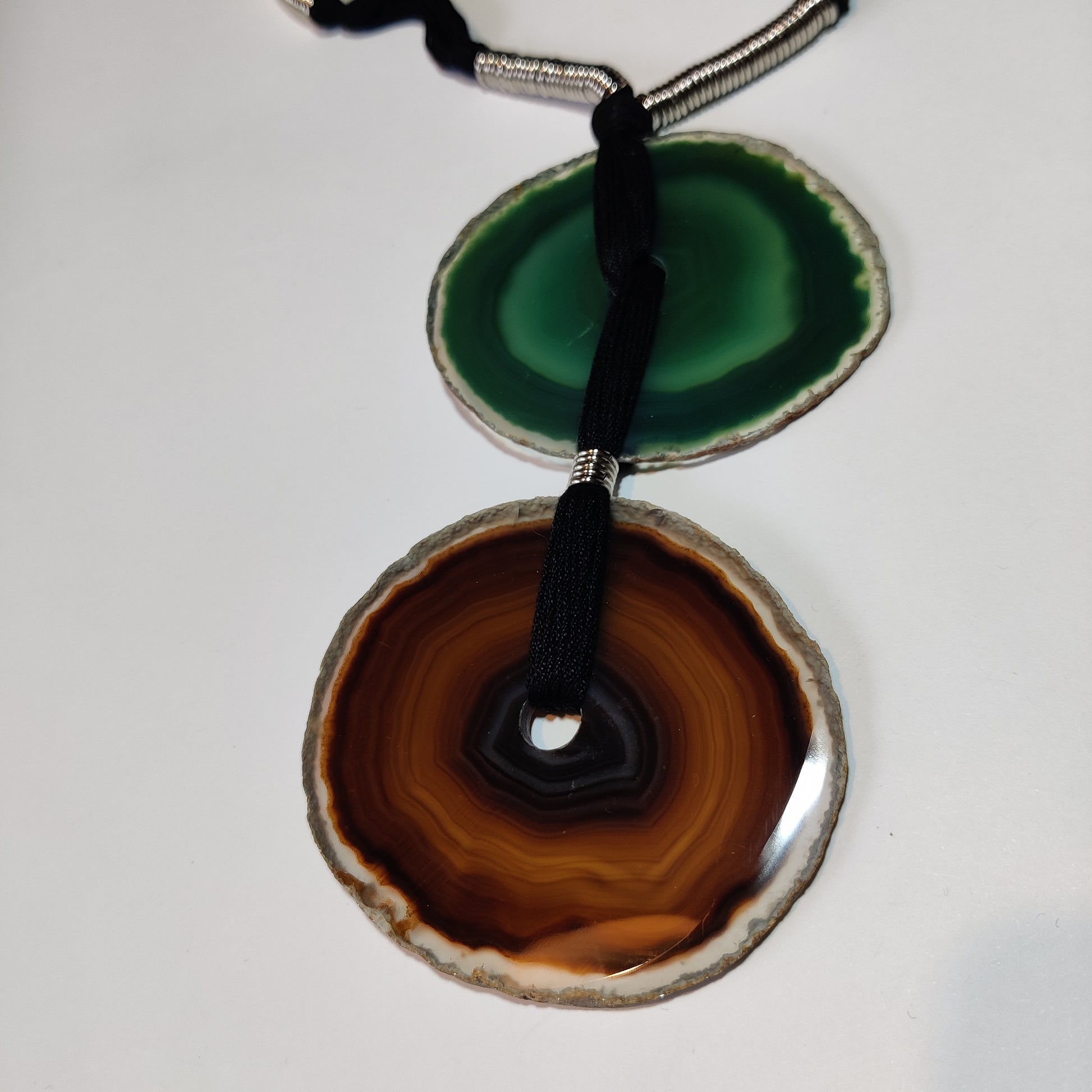 It features two fabulous agate disc slices with intricate concentric rings suspended on a black corded necklace.